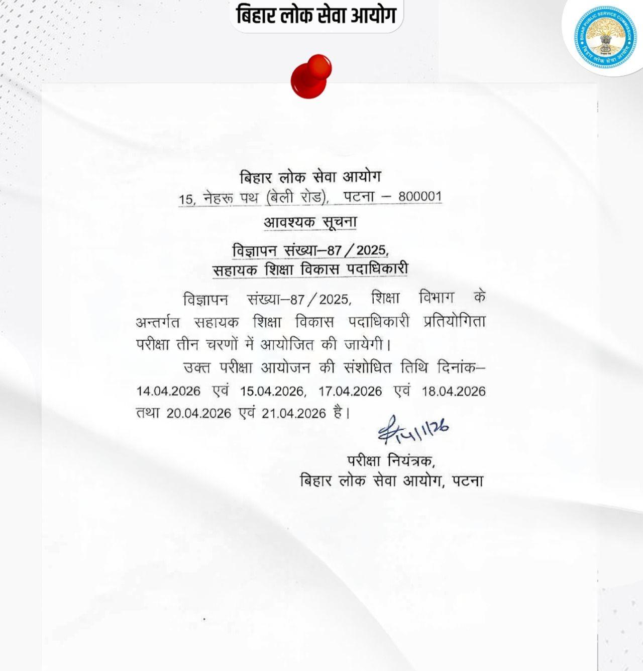 Bihar Public Service Commission (BPSC), has released the Exam Date on its official website for the Recruitment of Assistant Education Development Officer (AEDO) Examination 2025. The Exam is going to be conducted on 14, 15, 17, 18, 20 & 21 April 2026, The BPSC application process started on 05 December 2025, and candidates were able to submit their applications until 12 December 2025. Candidates can check their Exam City / Admit Card Soon using their Enrollment Number, Registration Number, or Date of Birth by logging into the portal. The direct link is provided below. (Advt. No. 87/2025)