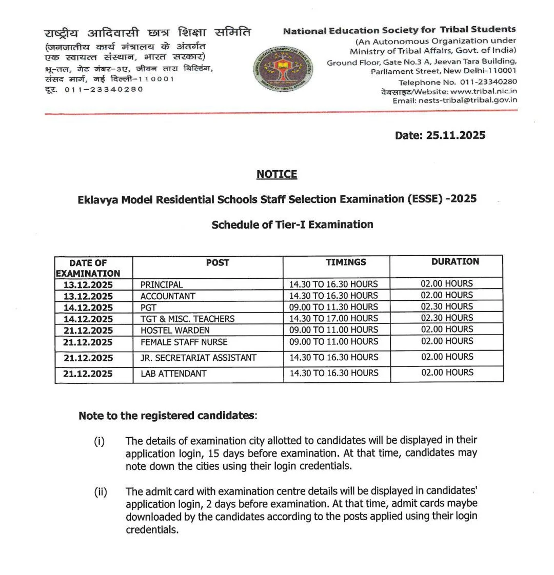 Ek Lavya Model Residential School (EMRS) NESTS, has released Exam Date on official website for the recruitment of Teaching/ Non Teaching Post. The exam will be conducted on 13 – 21 December 2025, and the last date to submit the application form was 28 October 2025. Candidates can check their Exam City Details / Admit Card Soon using their Enrollment Number, Registration Number, or Date of Birth by logging into the portal. The direct link is provided below. (Advt.No. NESTS/Adv/2025/01)